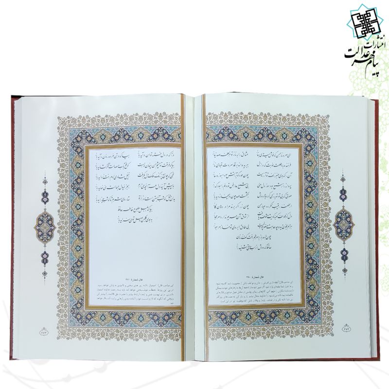 عنوان کتاب : دیوان حافظ شیرازی فالنامه قطع کتاب : رحلی مدل قاب : قابدار کشویی نوع جلد : چرمی برشی نوع کاغذ : تحریر خط : مصطفی اشرفی تعداد صفحات : 543 اندازه : 35.5 * 24 وزن : 2410 توضیحات و ویژگی : دیوان حافظ رحلی با جلد چرمی، قاب کشویی برش لیزری طرح پروانهای، انتخابی فاخر برای علاقهمندان شعر فارسی
